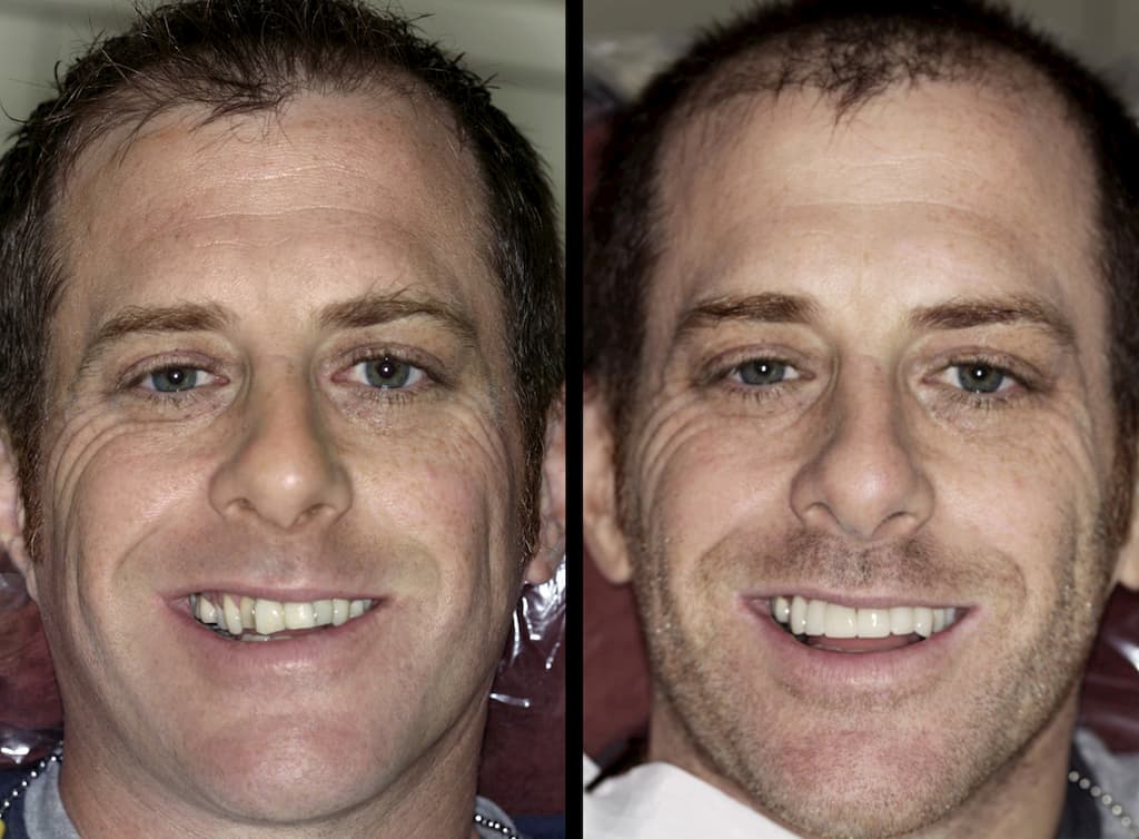 A strong jaw can be very appealing on a man, but often, as a result, the lower teeth extend further forward than the upper teeth. This causes the upper teeth to become angled and crooked, which is known in dentistry as a cross bite. While a cross bite has never hindered anyone from eating food, it does prevent a guy from having a great smile because his two upper teeth are not able to be in a prominent position. Sometimes only one or two teeth are in cross bite, and when that occurs, it is possible to correct the cross bite simply with porcelain veneers. As a child, Mike never wore braces; because of this and his jaw structure, almost all of his upper teeth sat behind his lower teeth in a cross bite. This issue could be corrected with surgery or full banded braces, but we were able to give Mike a quick “fix” that did not require surgery or years of braces. Instead, he wore Invisalign trays – a removable brace system – for only 6 months to move the upper teeth into a better position. After that, we placed 6 porcelain veneers on his top front teeth to create a strong masculine smile.